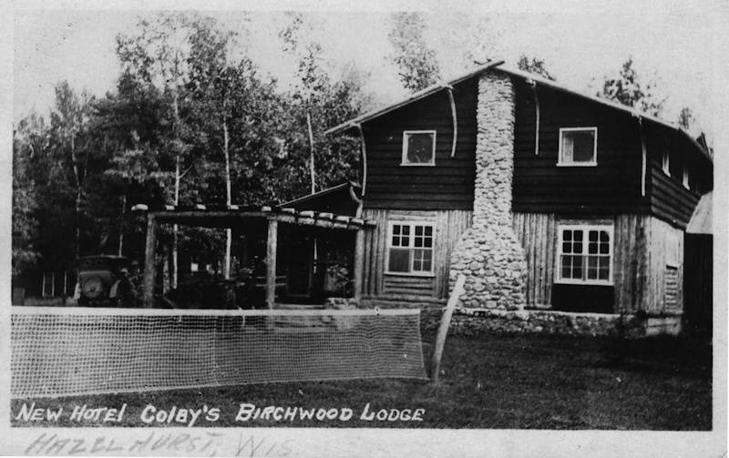 Our daughter came across this old photo from a post card we think dated July 23rd 1923 of the original lodge back when the resort was called Colby's Birchwood Lodge - prior to it's purchase by the Styza family. Got to love the old car and lawn tennis net! You can compare it to the current lodge picture below it. The left side lobby and the two story addition were added on in the early 40's.